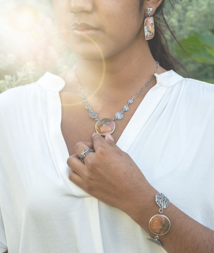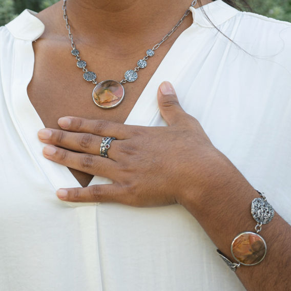 Each season, I create a group of work inspired by unique stones and raw textures. Each piece is made by hand, starting from silver sheet and wire and paired with hand-selected stones. No mold is made so no two pieces are ever alike. If you are inspired by a sold out One of a Kind piece and would like to place a custom order, please visit my custom order page to learn more.